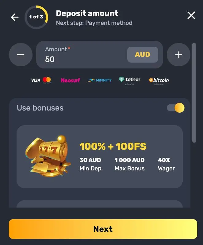| Prepaid Cards / Vouchers | Neosurf | 20 AUD | 6000 AUD |